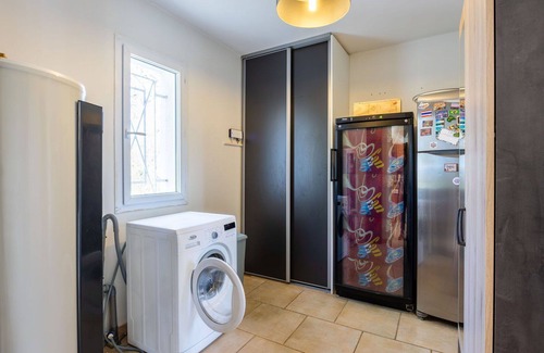 You will be staying in a 4-room house that spans over 130 square meters. The spacious living/dining room features an open-hearth fireplace, a dining table, a TV, satellite TV with international channels, a CD player, a DVD player, and air conditioning. This area leads out to the terrace and the swimming pool. The first bedroom has a French bed (160 cm wide and 200 cm long) and a TV (flat screen), with access to the terrace and the pool. The second bedroom also has a French bed (160 cm wide and 200 cm long) and leads out to the terrace and the pool. The third bedroom has two beds (90 cm wide and 140 cm long). The open kitchen is equipped with an oven, a dishwasher, four induction hot plates, a toaster, a kettle, a microwave, a freezer, and an electric coffee machine. There is also a shower, a separate toilet, and a double hand basin. The property has electric heating.