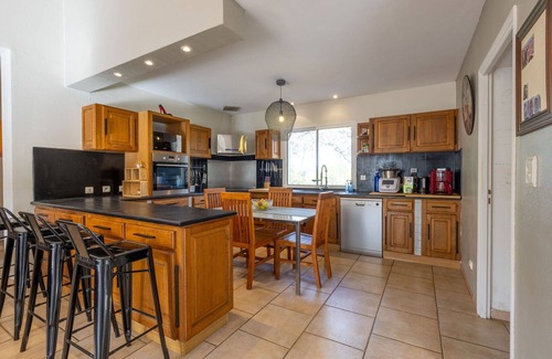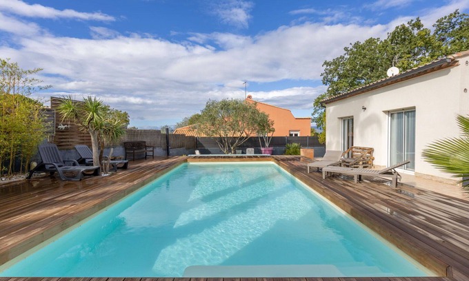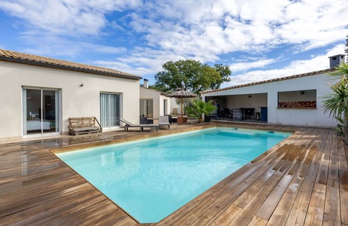 "Côté Sud" is a single-family holiday rental in Corneilhan, France, offering a private garden of 1,000 m2 with a lawn, wildlife garden, and a seasonal swimming pool (10 x 5 m) with an alarm system, pool house, and terrace. It also features Internet Wifi and parking for two cars on the premises.