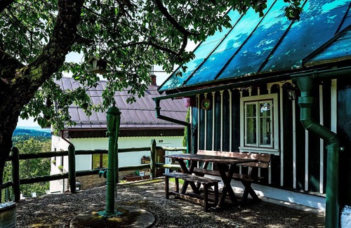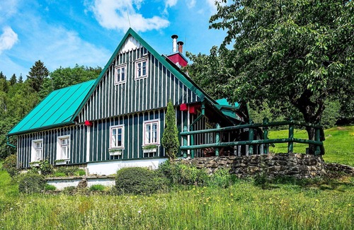 Železný Brod,Czech Republic is home to the very old "rustico" cottage "U Myšáka", built in 1905. This vacation rental boasts a quiet, sunny position on a hilltop with a private garden (not fenced), terrace, garden furniture, fireplace, and parking for two cars. It offers amenities such as a yard, internet WiFi, and parking.