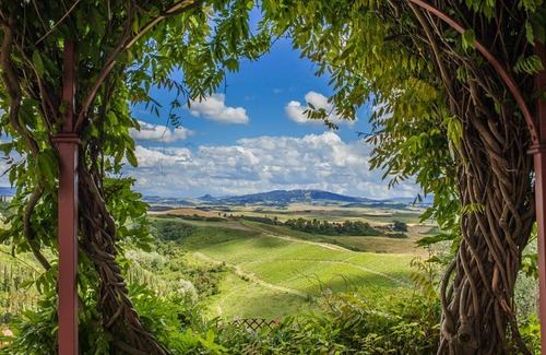Villa 'La Veduta' is a luxurious vacation rental offering a taste of medieval Tuscany. The Art Nouveau-style villa, built around 1800, boasts breathtaking views of vineyards, olive groves, and rolling hills surrounding Volterra. Enjoy amenities like a private fenced garden, seasonal swimming pool (May 1st - October 30th), terrace, garden furniture, barbecue, children's playground, table tennis, and on-site parking. Heating is available from November 1st to April 15th. Peccioli, Italy.