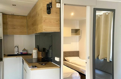 "Bungalow Isola Premium", 3-room bungalow 18 m2. Object suitable for 4 adults + 1 child. Bright, beautiful and modern furnishings: small living/dining room with 1 sofabed (80 cm, length 170 cm), dining table and air conditioning. Exit to the terrace. 1 small double bedroom with 1 double bed (1 x 160 cm, length 200 cm). 1 small room with 2 beds (80 cm, length 190 cm). Small, open kitchen (dishwasher, 4 ceramic glass hob hotplates). Shower/WC. Heating. Large terrace partly roofed. Terrace furniture. View of the countryside. Facilities: Internet (WiFi, free). Reserved parking (1 car) at the house. Please note: non-smoking house. Maximum 1 small pet/ dog allowed. LEAR 1167