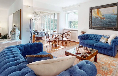 Large, luxurious villa "Il Laghetto, Residenza La Pinetina", 2 storeys, detached, renovated, surrounded by trees. 70 houses in the residence. In the district of La Pinetina 3.5 km from the centre of Appiano Gentile, 19 km from the centre of Como, 40 km from the centre of Milano, in a quiet position residential area (villas), 19 km from the lake, in the countryside. Private: property 3'500 m2 (fenced), large garden with lawn and flowers, indoor pool angular, heated (7 x 5 m, depth 200 - 230 cm) with salt-electrolysis pool-cleaning system. Shower/WC in the pool area, pool maintenance by the owner/gardener. In the house: sauna, fitness room (all included), table tennis, billiard table, table football, trampoline, central heating system, burglar alarm system. Available: bicycles (4). Linen change (suppl. charge extra). Towel change (suppl. charge extra). Room cleaning on request (extra). House maid daily on request (extra). Cook on request (extra). Breakfast possible on request (extra). Pre-arrival grocery service. Airport transfer (extra). Parking (for 4 cars) on the premises, single garage. Supermarket 3 km, restaurant, bar 500 m, railway station "Cadorago (CO)" 8 km, park "Parco Regionale della Pineta" 100 m, outdoor swimming pool 500 m. Golf course (18 hole), tennis, sports centre 500 m, children's playground 50 m. Nearby attractions: Como 19 km, Milano 40 km, Shopping Centre Arese 27 km, Golf Club La Pinetina (nella Residenza) 500 m, Golf Club Monticello 7.5 km. Well-known lakes can easily be reached: Lago di Como 19 km. Please note: car recommended. On request: airport transfer to the holiday accommodation. The owner does not accept any youth groups. 24hr guard. Residence with electric gates. Staff annex outside the house. Indoor pool with massage dies and counter-current, 25°C. Intermediate cleaning and change of linen and towels once a week for stays of 7 days and more included. Request of all extra services before arrival.
