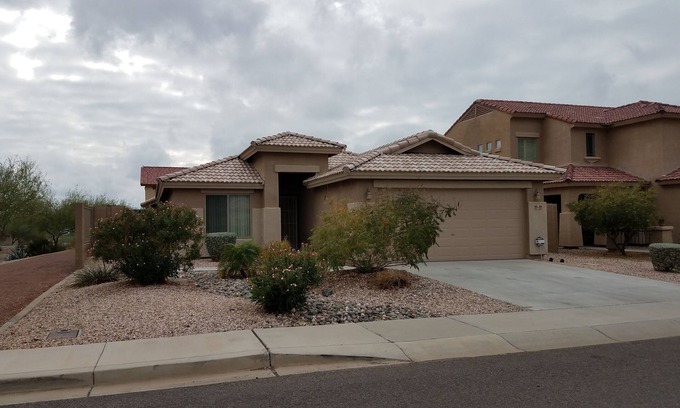 Rate includes all utilities and internet. This home features a wonderful, relaxining jacuzzi for your enjoyment. 20 Minutes drive to baseball stadium, football stadium, hockey stadium and NASCAR. Welcome to this beautifully decorated home with everything you would need and more. Large open kitchen with breakfast bar and pantry. The kitchen opens to the dining room. Spacious living room with den. Large master bath with separate shower and tub. Covered patio with BBQ, patio table with chairs to enjoy the AZ sunsets. Just bring your clothes and toothbrush!