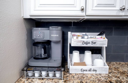 Modern Kitchen: The heart of the home, our fully-equipped kitchen will have you feeling right at home! It boasts sleek stone countertops, a large center island with a breakfast bar, a coffee bar, and brand new LG stainless steel appliances. You'll find everything you need to prepare meals, from the refrigerator and range to the microwave and dishwasher, all complemented by a convenient walk-in pantry. The kitchen is also stocked with coffee (Keurig and regular pot coffee). You will have access to pods, ground coffee, sweeteners, creamers, and to go cups for your convenience! If you wish to have specialty creamers, please bring your favorites with you to enjoy!