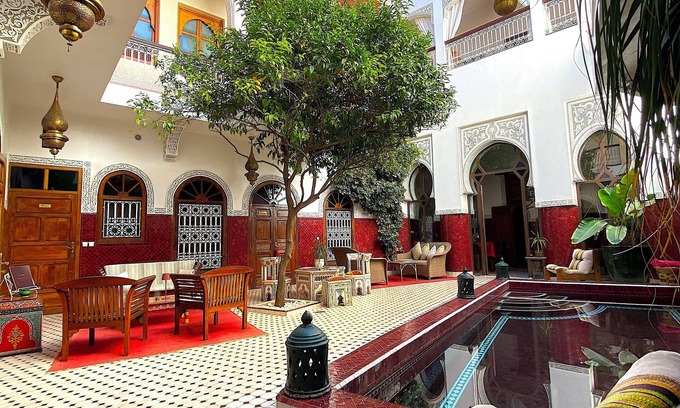 The Riad was completely restored in 2018 with Moroccan craftsmen and typical materials (tadelakt, bejmat, zelliges, plaster sculpture). We have made an exceptional place of relaxation with lounges in the 2 patios, a large swimming pool of 7m x 3m, 4 large terraces on the roof with deckchairs and pergolas. A living room with an atypical fireplace for your moments of reading or relaxation as well as a 65 inch TV, a dining room for breakfasts and dinners, ...