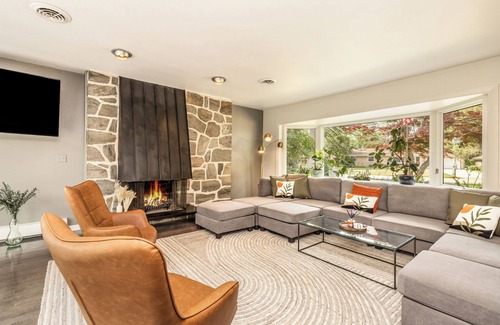 Escape to the Retro Riverside Retreat, which sleeps 16+! On the main living floor, you have access to a retro, mid-century modern living area with a bar and plenty of seating. Sliding doors open to the patio and backyard oasis. The open kitchen/dining room includes a large dining table that can seat large groups. Three bedrooms and 2 bathrooms round out the main floor.