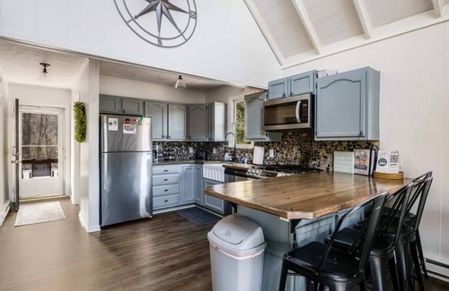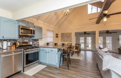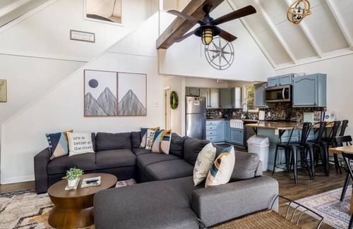 This unique and charming home boasts an open floor plan and vaulted ceilings on main level. Lots of natural sunlight throughout the home with an abundance of windows to soak up the beauty of the river from inside. Sit inside at the kitchen bar and be able to watch the river ease by. Enjoy the sunroom off the living area with patio doors that access the flat backyard. The first bedroom with queen bed is on the main level, across from the full bath boasting a bathtub and shower. Upstairs, you'll find one full bed and one day bed (with two trundles). Don't miss the charming "overlook" window looking down on the open living and kitchen space (kids will love this!). In the recently updated kitchen, there is river-rock backsplash, farmhouse sink and faucet, new stainless steel appliances, and plentiful cabinetry with pots and pans, cookie sheets, coffeemaker, utensils, cups, mugs, and full stocked kitchen inventory. Spacious pantry closet off the kitchen to store your groceries. Conveniently off the living room is laundry area plus an extra refrigerator for additional storage! As you venture down the hall, you'll find the third bedroom with a queen over queen bunk. A small, but oh-so-cute room with views of the river from the window. Right off this bedroom is a third bathroom with tiled stand up shower. Down the hall from the laundry area and bathroom is the largest bedroom. The master bedroom has a king bed plus a twin over twin trundle. The master has a private master bath with stand up shower and private access to the screen porch and hot tub. Our favorite spot in the house, a screened-In porch with vaulted ceilings, ideal for dining a-la-carte or sipping your coffee while enjoying the sounds of the river, along with the brand new hot tub and TV for hanging out! You can sit in the blazing hot jacuzzi tub and enjoy the sounds and views of the river babbling by. All of the beds boast luxurious mattresses for a comfortable nights sleep.