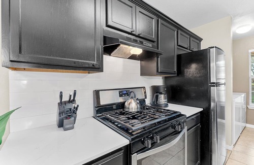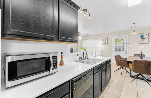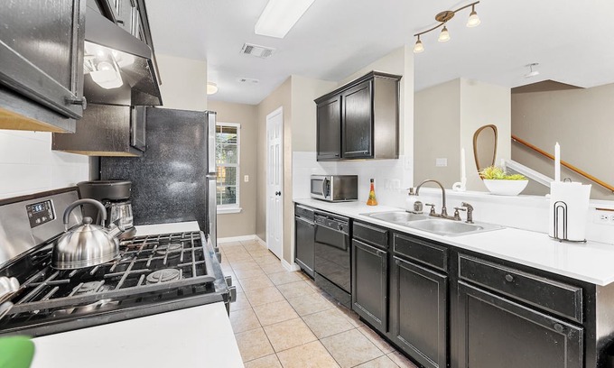 The kitchen area with numerous cooking appliances and spacious countertops. If you want to take a break from the Northern Austin restaurants, then this is the place for you.