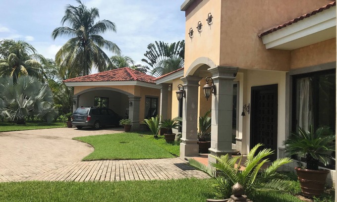 Get ready to relax in this marvelous 5-bedroom house in Acajutla. This delightful property perfect for larger groups! Beautiful and comfortable residence to vacation in a smooth and relaxed environment, tastefully decorated, with all the comforts, fully equipped and surrounded by perfect views, spectacular gardens with ceiba trees that make you fall in love and palm trees that invite you to rest and enjoy a pleasant stay, in a safe gated community and unique environment with family and friends! Full house with 5 bedroom with private bathrooms ensure convenience for all, all home AC, WiFi, dishwasher, washing machine and many other amenities that will make guests can enjoy a comfortable stay. We look forward to hosting you at our place.
