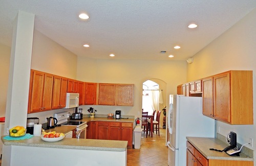 In front of the Kitchen is the large, comfortable Family Room. Relax in the large suede sofas and enjoy watching the 50" flat screen TV that is hooked up to cable and DVD player. The room has a large set of sliding glass doors that lead to the pool area.