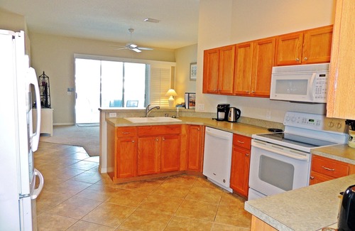The Kitchen features modern appliances including glass top range, dishwasher, above range microwave, French door refrigerator and disposal. There is plenty of counter space for the gourmet guest to feel at home. There is also a breakfast bar with stools for casual dining.