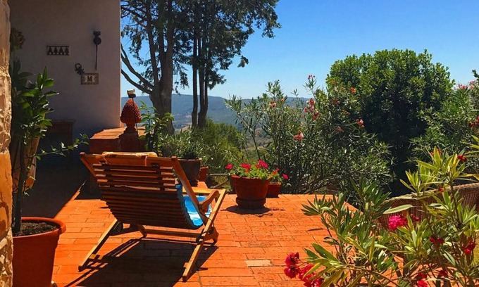 The 600 sqm large and beautiful garden with olive, cypress, lilac and almond trees adjoins the north terrace. With its seating and a beautiful view of the valley, it invites you to a picnic with vino, olives and pecorino.