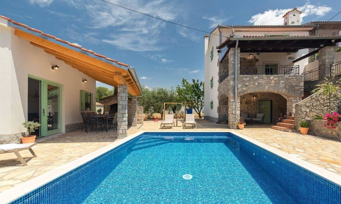 Beautiful stone house for 8 - 10 persons with private heated pool.The house is located in a small and quiet place Vrh on the island of Krk. The house has a main house and a separate guest house - in totalfour bedrooms,three bathrooms, two living rooms and two kitchen. It is fully equipped and air-conditioned. wifi, SAT-TV, parking spot provided.The vicinity of shops, restaurants and beaches makes this house ideal for spending holidays with family or friends.