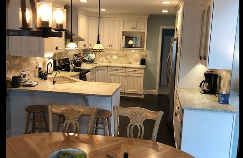 The first floor also has an additional half bathroom and complete laundry room – tons of space. The brand-new kitchen is absolutely beautiful and the kitchen table can accommodate 10 people and 2 more at the breakfast bar.