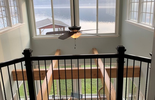 Our home was just built in 2014, directly on the water in a protected cove. The property is flat with only three stairs – from the driveway to waters’ edge. (the huge deck has 2 steps, with 3 more to the dock). Check out the photos of the beautiful, brand new dock with attached sunning area. Your family & friends will love this spot for swimming, fishing and sunning. The dock has a boat whip provided for your boat (can accommodate up to 26’). The lake is 16’ depth at the end of the dock.