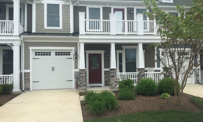 Our house is a well appointed three bedroom townhouse on a quiet street located in The Commons Section in the Community of Bayside, just off of Route 54 in Selbyville, Delaware. We are approximately 6 miles from both the pristine beaches of Fenwick Island, Delaware and Ocean City, Maryland. It is a two story townhome with a Master bedroom and adjacent full bathroom on the first floor. The well designed kitchen and spacious family room as well as dining room are also on this floor as well as a powder room. There is plenty of parking outside the front door which is very convenient. The wide common lawn just feet away from the front door can be used for lawn games and other sports. Out back we have a very private paved patio with table and chairs along with a propane BBQ for your use as well. On the second floor you will find a bedroom with a Queen Size bed , another bedroom with two Double beds and a full bathroom. Another TV and sitting area is on the second floor in our loft. For you music lovers, The Freeman Stage is a venue from which many nationally known acts perform throughout the summer months. We offer the use of several bicycles to be used at your own risk and convenience. If you are looking for a peaceful alternative close to the beach then this home is for you!