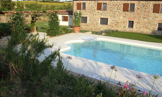 Surrounded by fields of sunflowers and wheat in the rolling hills of the unspoiled Val di Chiana, this lovely Tuscan country villa is located between two charming hilltop villages filled with great restaurants, wines, and exceptional shopping - as well as art, history, and beautiful views.