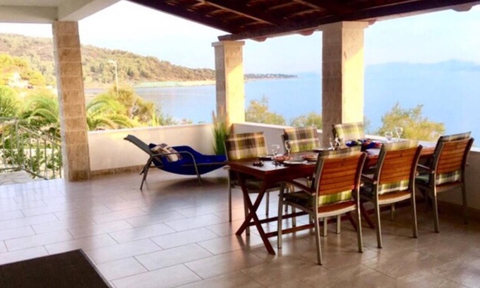 This beautiful holiday home offers you a wonderful panoramic view of the sea. The house is located on the water in the small town of Stomorska on the island of Solta and consists of two residential units. One on the ground floor and the other on the upper floor, both units are connected by an internal staircase. Ideal for two families who want to spend the vacation together. Each apartment has two bedrooms, a bathroom, a combined living / kitchen area with a fully equipped kitchen with dishwasher, air conditioning in the living area and then a beautiful terrace with a wonderful view. The spacious covered terrace on the ground floor is ideal for social gatherings and sociable summer evenings. You can get into the water directly at the house via steps. There are several pebble beaches nearby. Stomorska is a small fishing village with many restaurants serving local specialties on its harbor promenade. There is also a diving center nearby, where you can learn to dive and explore interesting underwater world.