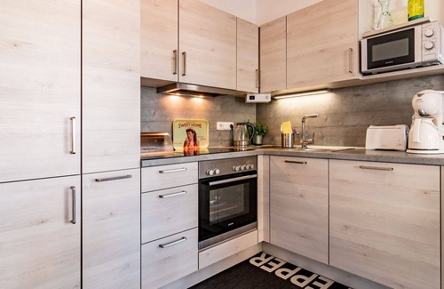 The lovely, modern and high-quality equipment is complete with free Wi-Fi, TV and a fully equipped kitchen. In the 3 double rooms with box spring beds as well as a bedroom with two single beds is guaranteed restful sleep. The large bedroom also has space for a zubuchbares cot.