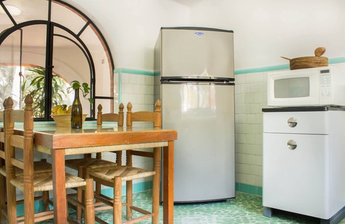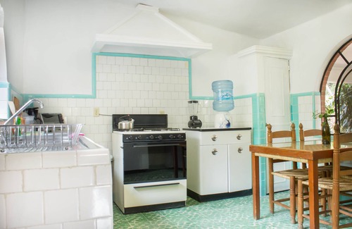 Vintage Villa Taxco is a large one bedroom bungalow with two double beds and an ensuite 1950´s tile bathroom with natural, herbal amenities of shampoo, conditioner and soap with luxurious 100% cotton hand, face and bath towels and hair dryer. Villa Taxco has a fully equipped kitchen for any length of stay, large living room with chimney and a 32¨ Netlix flat screen smart TV. Two terraces, one enclosed, with a wrought-iron table and chairs looks out over lush vegetation for alfresco meals. These eight homes are surrounded by manicured tropical gardens, a magestic 40 ft. Venetian tile pool/cabaña with bbq/smoker, chaises, tables, chairs and towels in a secure, upscale neighborhood, ¨Bellavista" with a view, to the valley.