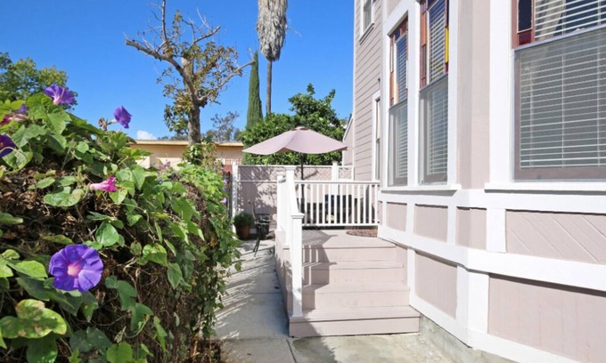 Located in a Historic District on the Slope above Downtown San Diego, this highly upgraded 1 bedroom, 1 bathroom completely private unit within a beautiful and historically designated Queen Ann Victorian building. No expense was spared in the design of this highly upgraded home which accommodates up to 2 guests. The living area features high ceilings, gorgeous hardwood floors, LED smart TV, dining table and chairs framed by multiple windows. The kitchen is beautifully designed with granite counters, accent cabinet lights, microwave, gas stove, refrigerator and everything you will need to cook complete meals during your stay with us. The bathroom has high ceilings and is equipped with plenty of towels. Shampoo, conditioner, body wash and a blow dryer are all provided. The bedroom features a Queen bed, mirrored closet wardrobe doors, LED Smart TV, ceiling fan and air conditioners. The bed has memory foam mattress. Both TV’s have streaming capability. This unit also features a private patio with Patio Table, Umbrella and chairs as well as a barbecue grill. Additional items provided to our guests include beach chairs, beach towels, a boogie board, lighted make-up mirror, an iron and ironing board and a high chair for the little ones. The unit is beautifully decorated with furniture and drapes of modern classic design. The property is located 5 minutes driving distance to the Convention Center, Gas Lamp district, Ball Park, Coronado Island, the Airport, Balboa Park and the Zoo. Freeway access is located around the corner and bus stop transits to and from downtown are located within a block of the property and local beaches are within easy driving distance. Some of Golden Hill’s most popular spots such as the Turf Club, Panchitas Bakery, Krakatoa Coffee Shop, Luigi's Pizza and Golden Hill Park are within walking distance. Additional features in the common areas include a Barbecue Grill, Gazebo with table and chairs and a Fire Pit with wood provided. Enjoy a morning cup of coffee and city views from the patio table and chairs provided on the front porch. Grill your favorite foods on a gourmet barbecue and relax with dinner under a lighted Gazebo. Share the day’s events and memories of your experiences in San Diego with your favorite beverage by the warmth of the fire pit. There is an on-site coin operated laundry facility. Enjoy these beautiful and unique accommodations while experiencing all the best that San Diego has to offer.