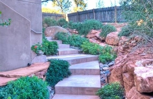 Keywords: Panoramic red rock views from expansive windows. Private and secluded. Light and airy. Over-sized, jetted tubs for two in ensuite baths. Upscale amenities. King-bedded master with fluffy, non-allergenic bedding and high thread count linens. Gas fireplace. Split master / Open floor plan. Private entrance. Well-appointed kitchen with everything the family chef requires. Private covered deck with gas BBQ. Common yard and view deck with seating and lounges for sunbathing. Secluded, privacy screened by 14 foot high vegetation, shared, sparkling, adults-only outdoor hot tub. Convenient on-site designated parking. Easy stroll to nearby dining, galleries, Marg's Draw National Forest trail head and Oak Creek. Complimentary bundled cable and efficient WiFi connection with dedicated modem. Private washer & dryer. Contact-free check-in. Scrupulous cleaning and disinfecting for your health and safety!