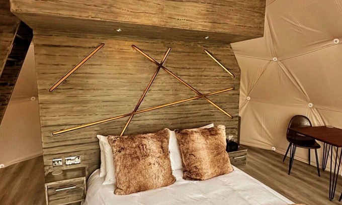 Your 30 square meter luxury dome at Ashdown features a thoughtfully designed two-room layout. The main living room flows seamlessly into the bedroom area which contains two French beds. The well-appointed kitchen connects to both spaces, while a full bathroom with shower and WC provides convenience. A terrace extends your living space to the outdoors.