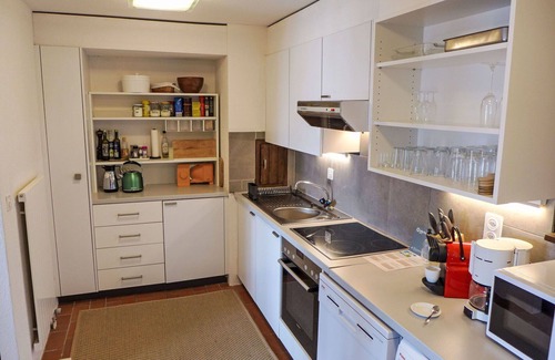 The property is a 5-room semi-detached house spanning over 120 square meters across three levels, facing south. It can accommodate up to four adults and two children. The house has been partially renovated in 2024 and features comfortable and beautiful furnishings. On the ground level, there is a small living/dining room with an open-hearth fireplace, cable TV, radio, and CD player, leading out to a terrace. The open kitchen is equipped with an oven, dishwasher, four ceramic glass hob hotplates, toaster, kettle, microwave, freezer, electric coffee machine, Nespresso capsules (extra), raclette grill, and a fondue set (chinoise, cheese). The upper floor houses a large room with a double bed (2 x 90 cm, length 200 cm) and access to a balcony, as well as another room with a single bed (90 cm, length 190 cm). There is a bathroom with a toilet and a separate toilet on this level. The second upper floor features a room with sloping ceilings and two single beds (90 cm, length 200 cm), and a children's room with sloping ceilings and one single bed (90 cm, length 190 cm), along with a shower and toilet.