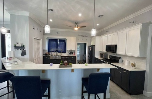 This villa is located in the quiet neighborhood of Lucaya with a 6 minute driving commute to several public beaches. In addition, the property rests on a salt water canal with kayaking availability which is included in the booking. There is also an entertainment space on property with a pool table and a variety of other games. There are also miles of roadways for running or walking.
