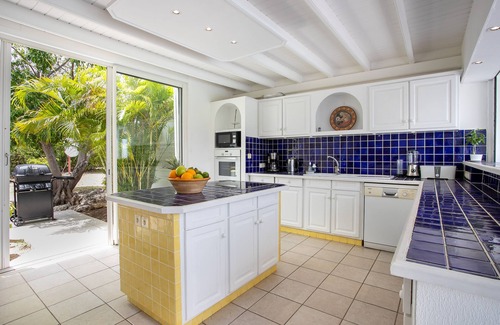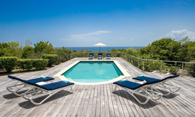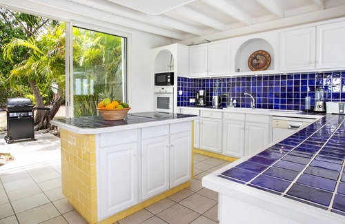 From its hillside location overlooking La Samana Hotel, you can enjoy a breathtaking view of Baie Longue and beautiful sunsets.This spacious and light-filled villa features tile floors and a graceful verandah surrounding the pool.
