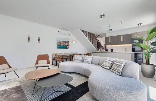 The 1,100m² garden has a large terrace with a heated pool and outdoor shower, as well as sun loungers by the pool where you can relax under a parasol or sunbathe. There is also a charcoal barbecue on the terrace and in the fully covered area next to the house there is a summer kitchen with a large dining table and a wine fridge, so you can always enjoy perfectly chilled drinks.