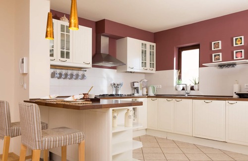 Ground floor has a spacious, super equipped kitchen with a large, American-style fridge. Kitchen, dining area and living room are connected into one large entertaining area. There is a small toilet with washing machine on the ground floor as well.