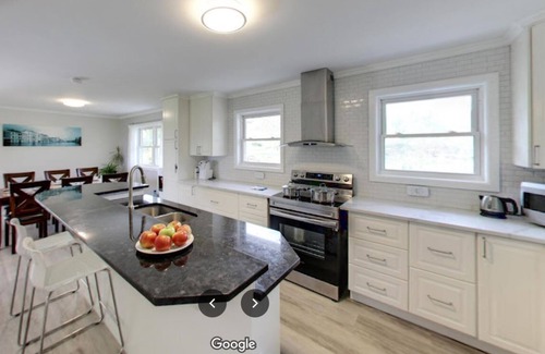 The house has been totally renovated with a modern kitchen, the sun room has a stylish fireplace insert and a small pool table. There are four bed rooms. The house has six beds, The master room has a king size bed, the large room upstairs has one queen size bed, and one double bed, the smaller room upstairs has one queen size bed and one single bed. There is also a bedroom at basement with one queen size bed.
