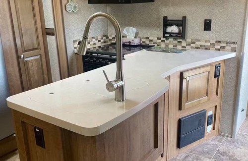 Camper #1 features 2 bedrooms - one master bedroom with a Queen size bed and ensuite (1/2 bath). The second bedroom has 3 single bunks. The kitchen table also folds down and can fit 1-2 additional children.