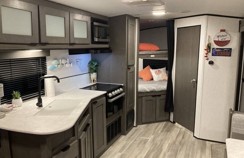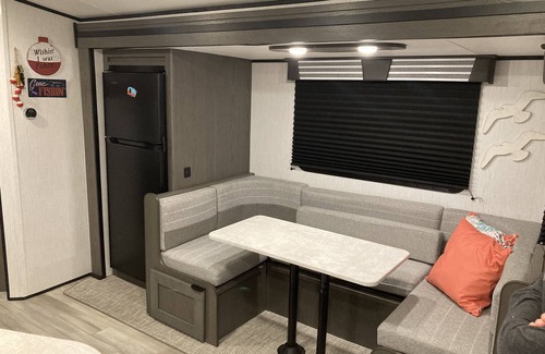 Beautiful new camper. Very clean. Large rv cover and large concrete. Most other places don’t have a cover. During our Texas heat with no cover it makes a rv very uncomfortable! You need the cover to keep you cool and out of the rain.Large concrete pad . Some other rentals just sit on grass. So just sit on our concrete covered area and barbecue and watch the barges go by. Has a fire pit with a grill on top of it to cook on.