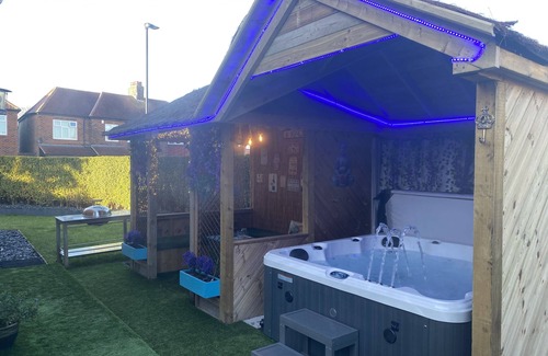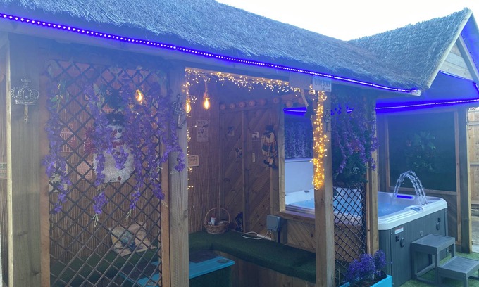 The garden is grassed area the patio doors lead to a decked outside area with a fantastic purpose built covered gazebo seating area for a at least 12 guests and a BBQ. We can provide hot tub on special request at an extra cost, please get a quote after booking, you can contact me directly to book, must have at least 24 hours notice.