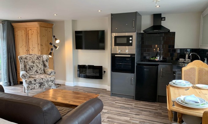 Beautifully presented spacious studio with garden, views of open countryside, patio and ample parking. Fully equipped kitchen, super king bed, en-suite shower room, dinning area, double sofa bed (additional sleeping space), 44” smart TV and WiFi. Nr Beeston and Peckforton Castle. Ideal for country walks, cycle routes, pubs and restaurants. 5 minute walk to the Inn at Huxley, 3 miles to Tarporley, 6 miles to Chester and Oulton Park. Close to Delamere Forest and Bolesworth Estate. Host on site.