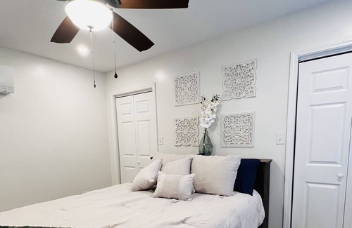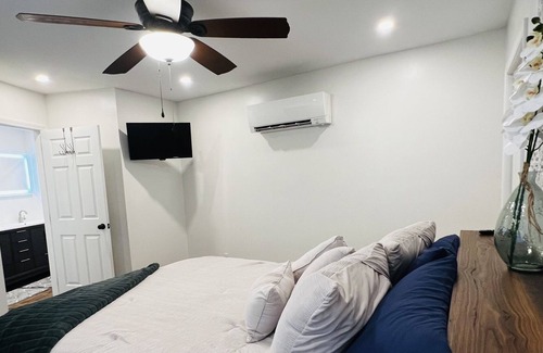 Each bedroom features a memory foam queen sized bed and flat panel smart tv and ceiling fan.