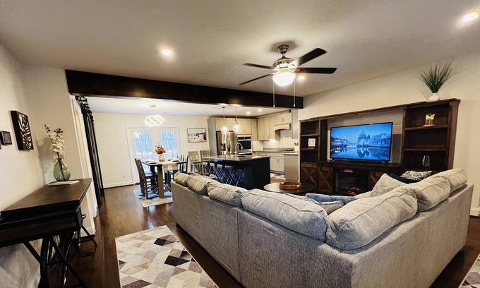 From the moment you arrive with the freedom of self-check in you’ll find that our home’s open concept allows for everyone to be together with comfortable seating for all. The living room features a large sectional while the entertainment center houses a smart tv, board games and a fireplace insert for a cozy fall/winter feeling.