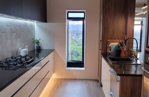 Inside, the renovated kitchen features a stylish hex-tile backsplash, black granite countertops, and warm timber cabinetry, complemented by elegant under-cabinet lighting. Floor-to-ceiling windows in the lounge frame sweeping views of Mount Pirongia, creating an ever-changing backdrop to your stay. The main bathroom mirrors this attention to detail, with dual marble basins, a walk-in shower, and a luxurious soaking tub. With uninterrupted views of Mount Pirongia from the living room and garden, you’ll feel connected to nature even while indoors.