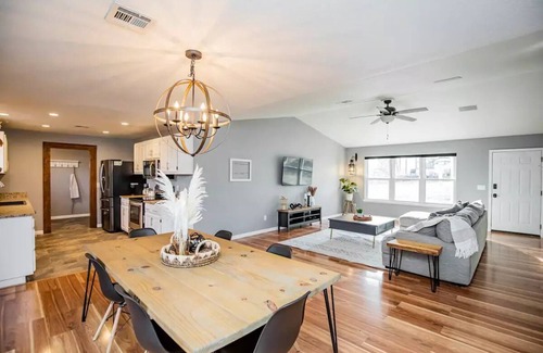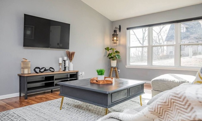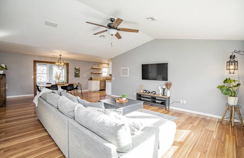 Serene sanctuary filled with natural light. Very cozy & private. This house has a spacious deck with small views of the lake in the winter & nature in the summer - perfect for relaxing, drinking a cup of coffee, tea, or a glass of wine, and viewing the stars in the night sky from the hot tub. Furnished with a king bed in the primary bedroom as well as comfortable queen beds in the guest rooms. Has BOAT PARKING! Easy FREE access to the lake, historic downtown Rogers, & all NWA has to offer!