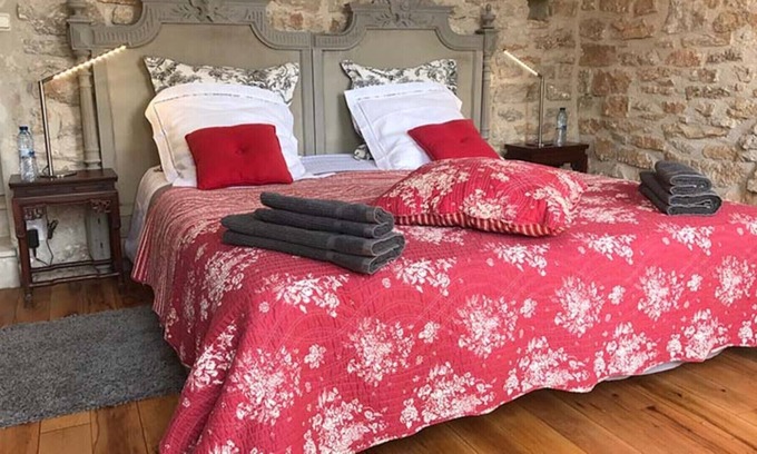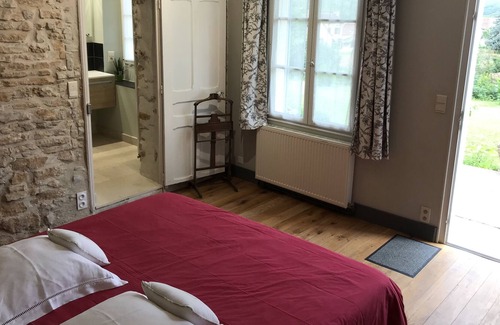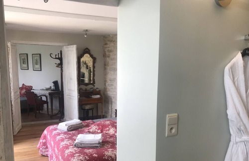 The spacious and sunny suite (36 m2), facing south on the ground floor. You will appreciate the stone walls, the antique furniture, the carved wooden headboard, the toile de Jouy curtains, the soft gray and white tones, the adjoining living room with a bed of 90/190, the bathroom. extensive water shower, toilet, flat screen TV. Romanticism assured, the double bed in 180/200 is also adjustable in 2 separate beds of 90. The suite can also accommodate a family. Private parking. Independent access. Our animal friends are not accepted. All our rooms are non smoking.