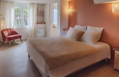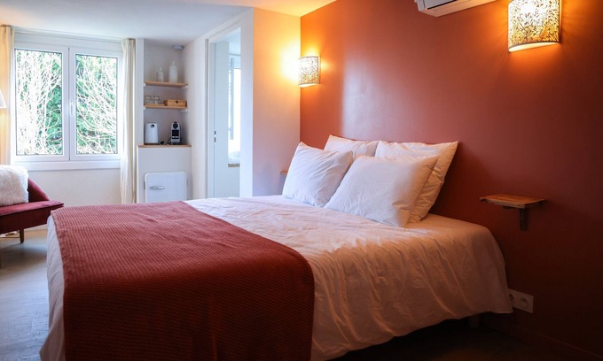 Bed and breakfast Maison Perbos 1556 - Lurra in La Bastide-Clairence offers 20 sqm of space for up to 2 guests. You have 1 bedroom with a Queen size bed measuring 160 x 200 and 1 private bathroom equipped with an Italian shower. The room creates a warm atmosphere through brick color tones and natural materials. Private amenities include air conditioning, WiFi, flat-screen TV, breakfast included, and beach towels. You have access to a courtesy tray for hot beverages throughout the day and a small refrigerator for your convenience.