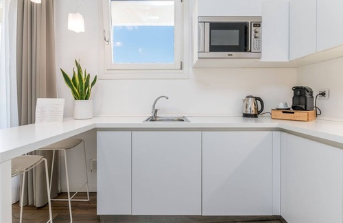 The suite, with an elegant and modern design, features a separate bedroom, a large living room with a fully equipped kitchenette and a contemporary bathroom with complimentary toiletries and a hairdryer. Among the comforts included are free Wi-Fi, air conditioning and a flat-screen satellite TV, ensuring an experience of relaxation and well-being.