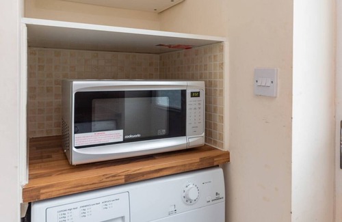 The kitchen has a fridge, a hob, an oven, a kettle, a freezer and a microwave.