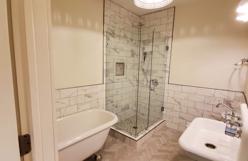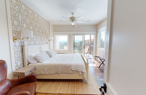 Bedroom 9 is a deluxe room in the The Big Creek Lodge on the 350 acre resort property of Luna's Trail Farm and Event Center. Guests will enjoy beautiful views of Hanging Rock and Pilot Mountain from their private balcony. This deluxe room includes a claw foot tub and a walk in shower. It is our smallest room, but it easily has the best view, with Pilot Mountain visible from bed! There is a restaurant downstairs serving meals Thursday evening - Sunday evening