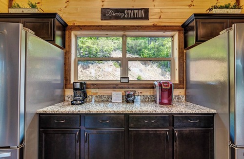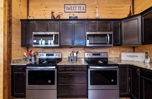 Enter Bee Chillin' Bear Inn on the middle level. This level features an open air common space with the dining area, kitchen, and living room. The dining table seats 18 comfortably, with additional seating for 7 at the breakfast bar and 4 at a high top table off of the dining room. The kitchen is fully equipped with two side by side refrigerators (with icemakers), two glass top stoves, two ovens, two microwaves, two dishwashers and a Keurig coffee maker. Hidden under the kitchen counter is a large under counter refrigerator to save more room for your food items in the refrigerators. Enjoy whipping up your delicious meals in this fully equipped, well stocked kitchen!