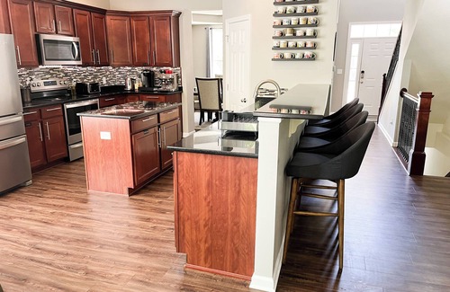 Bring the whole crew to our great home with lots of room for relaxing and fun! Indulge in our comfortable, yet elegant 5 bedroom/4 full-bathroom retreat. Enjoy movie nights in the private theater, stay active in the gym, and unwind in the spacious backyard. With a game room, pool table, and foosball, entertainment is endless. Plus, explore the vibrant dining scene and nearby parks. Your ideal getaway awaits!
