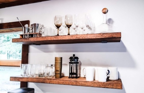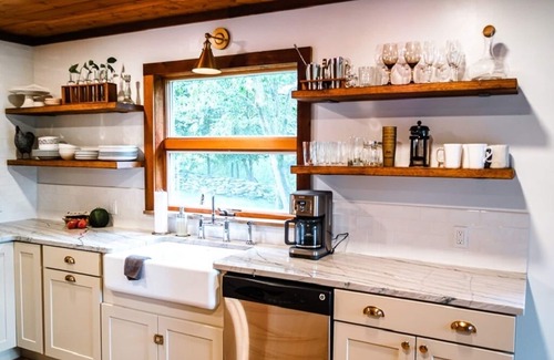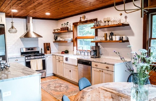 - Main house: 2 bed/1 bath, indoor fireplace, dedicated workspace with 24" monitor, outdoor deck with view of the pond, grill, and outdoor dining area. Fully stocked kitchen with everything you need for cooking plus a wine fridge.