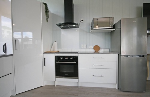 Bi-fold doors welcome you inside where light-filled living awaits. This studio-style accommodation is fresh and functional, with a modern kitchen and stylish dining set.